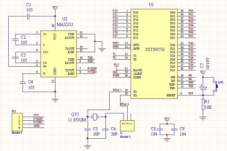 电路图如下这里只所以要选用SST89C58,主要是有以下两点: