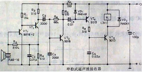 单稳式超声波接收器电路原理图,超声波换能器R40-16谐振频率为40kHZ,经R40-16选频后,将40kHZ以外的干扰信号衰减,只有谐振于40kHZ的有用信号(发射机信号)送入VT1~VT3组成的高通放大器放大,经C5、VD1检出直流分量,控制VT4、VT5组成的电子开关带动继电器K工作。由于该电路仅作单路信号放大,当发射机每发射一次超声波信号时,接收机的继电器吸合一次(吸合时间同发射机发射信号时间相同),无记忆保持功能。可用作无线遥控摄象机快门控制、儿童玩具控制、窗帘控制等。电路中VT1β≥200,VT2β≥150,其他元件自定。电路不需调试即可工作。如灵敏度和抗干扰不够,可检查三极管的β值与电容C4的容量是否偏差太大。经实测,配合相应的发射机,遥控距离可达8m以上。在室内因墙壁反射,故没有方向性。电路工作电压3V,静态电流小于10mA。