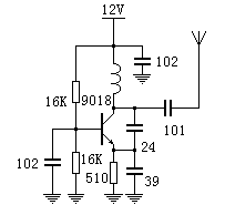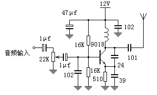 图中的线圈用1.0mm的漆包线在3.2mm的钻头上绕6-8圈,可覆盖88-108MHz,7圈时在100MHz附近。按上图连接好,其实就已经是一个简单的发射机了,通电即可发射,不过发射的是未经调制的等幅信号,附近的调频收音机接收到信号只会出现静音。像下图那样加上调制信号,就可进入实用状态了。