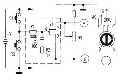| 选择分类:当前分类——小说笑话 相关联或者相类似的文章: 23年前,有个年轻的女子~~~~(2191) MY8848网站销声匿迹 消费者(1196) 有地下王国吗?(1182) 七仙女离婚(1127) 电容器的参数与分类(1126) TL431特性及应用(1074) 地球的黑洞-百幕大三角区(1069) 录取通知书迟一年 家长和学校各执(1018) 三途河之鬼——人类真任性(1014) 白女孩(997) 优胜劣汰的用人原则(989) 何为天堂(987) 知识能否改变命运?(978) 求△V特性镍氢电池充电单元电路图(974) 深圳美的惊世绝仑(967) 做一个可爱的人(958) 无聊的笑话~~!!!(945) 三极管的开关作用(924) 简易FM无线话筒!装好的成品板(921) 考考你的眼睛——请找出那个轮子在(920) 首页 前页 后页 尾页 本站推荐: | 自作电子音量控制 大家都知道场效应管可用作电子音量控制,但所用型号的管子不易找到。在此笔者介绍一个简单的方法,只要有一个电容式驻极话筒即可实现。 制作时,首先拆开驻极话筒,里面有一个结型场效应管、一片振动模和一块带孔的金属极板等附件,场效应管的引脚极性及控制电路见图1。以CXA1191M(CXA1019)芯片收音机为例,IC的第④脚是电子音量控制端,该端电压越高音量越小,电压越低音量越大。当接下S1时,V+通过R1、R2、⑧脚端向C1充电(实测⑧脚对于V+而言为负极,对地而言为负极,对地而言为正极)。 由于电容的贮电作用,V1的G极电压随C1的充电而缓慢上升,S、D间电阻减小,使得④端电压下降,因此音量输出增大;按S2时,C1所贮的电能经过R2、R1、S1向地放电,V1的G极电压下降,S、D间电阻增大,④端电压因此升高,输出音量减小;点按S1、S2可得到你所需的音量。电源来自收音机机内电源。 ![]() 值得注意的是:原机W1必须拨至音量最大处,或者将W1拆除。C1为电解电容,有条件者可使用钽电解。 该制作的电路图和印板图见下。 ![]() 1、 本站不保证以上观点正确,就算是本站原创作品,本站也不保证内容正确。 2、如果您拥有本文版权,并且不想在本站转载,请书面通知本站立即删除并且向您公开道歉! |