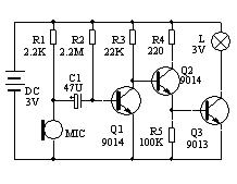 R1为话筒MIC的偏置电阻,R2、R3使Q1处于临界截止状态,当话筒MIC接收到音频信号后,通过C1耦合给Q1基极,在音频信号的正半周加深Q1的导通,Q1还是导通,同时把Q2的基极电位拉低,Q2截止,对电路没有多大影响;在音频信号的负半周使Q1反偏压截止,Q2导通,Q3也导通,小灯炮点亮。由于电容C1充放电需要一个过程,所以小灯炮点亮后会延时一段时间。调整C1的大小可以改变点亮后延时熄灭的时间,容量小延时时间短,容量大,延时时间长,可以在1微法到几百微法选取。改变R2阻值的大小可以改变Q1临界截止度,也就是改变灵敏度,阻值大,灵敏度高。