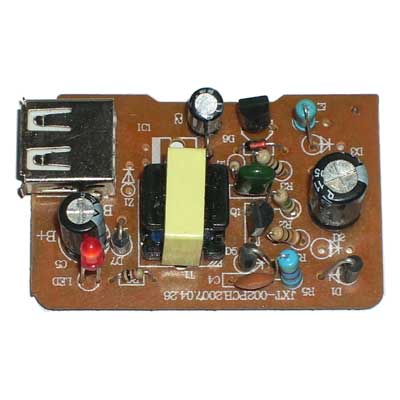 仔细检查线路板安装无误后,要通电试板时,可以在PCB板直接焊一个220V插头线,为了安全起见,请大家先在电源串联一个10W的白炽灯泡,以防止短路或者接错,千万注意安全,还有,元件一不小心就烧坏了,烧坏了需要再买才行。如果安装无误,用万用表可以测得USB 1脚和4脚应有5V的电压输出,电源指示灯亮,确认电路板装配无误。