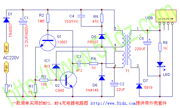 USB充电器套件,又名MP3MP4充电器,输入AC160-240V,50/60Hz,额定输出:DC 5V 250mA(标签贴纸为500mA,如果要长期输出更大电流,请更换Q1为13003)。MP3和MP4在全国范围大量流行,不过作为日常用品的充电器由于直接和220V高压相连,具有故障率较高,容易损坏的特点,特别是买到那些不成熟的产品后,真是苦不看言。最后,受学校老师委托,我们联系到了一款成熟量产的充电器套件,现在一同给广大电子爱好者分享。