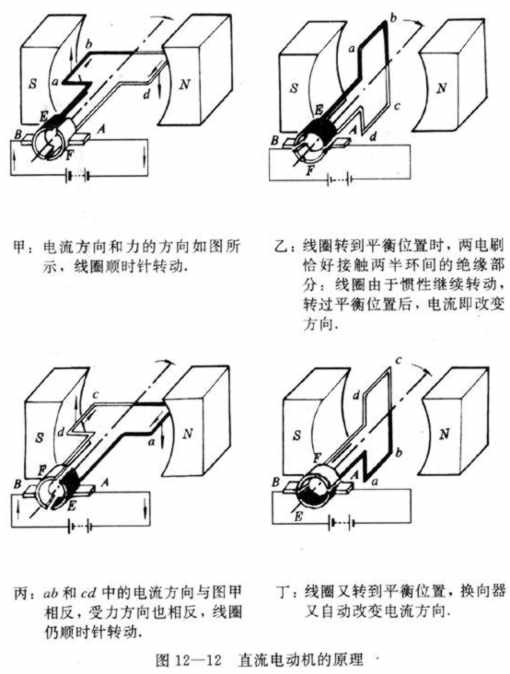 图12-12是直流电动机的原理图。这种电动机用直流电源供电,所以叫直流电动机。线圈的两端各连一个铜制半环E和F,它们彼此绝缘,并随线圈一起转动。A和B是电剧,它们跟半环接触,使电源和线圈组成团合电路。两个半环E和F叫做换向器。每当线圈刚转过平衡位置,换向器就能自动改变线圈中电流的方向,仔细研究图12-12,就会了解这一点。